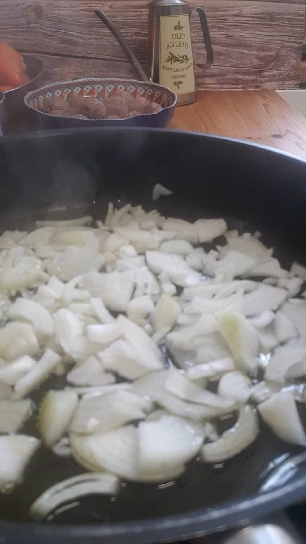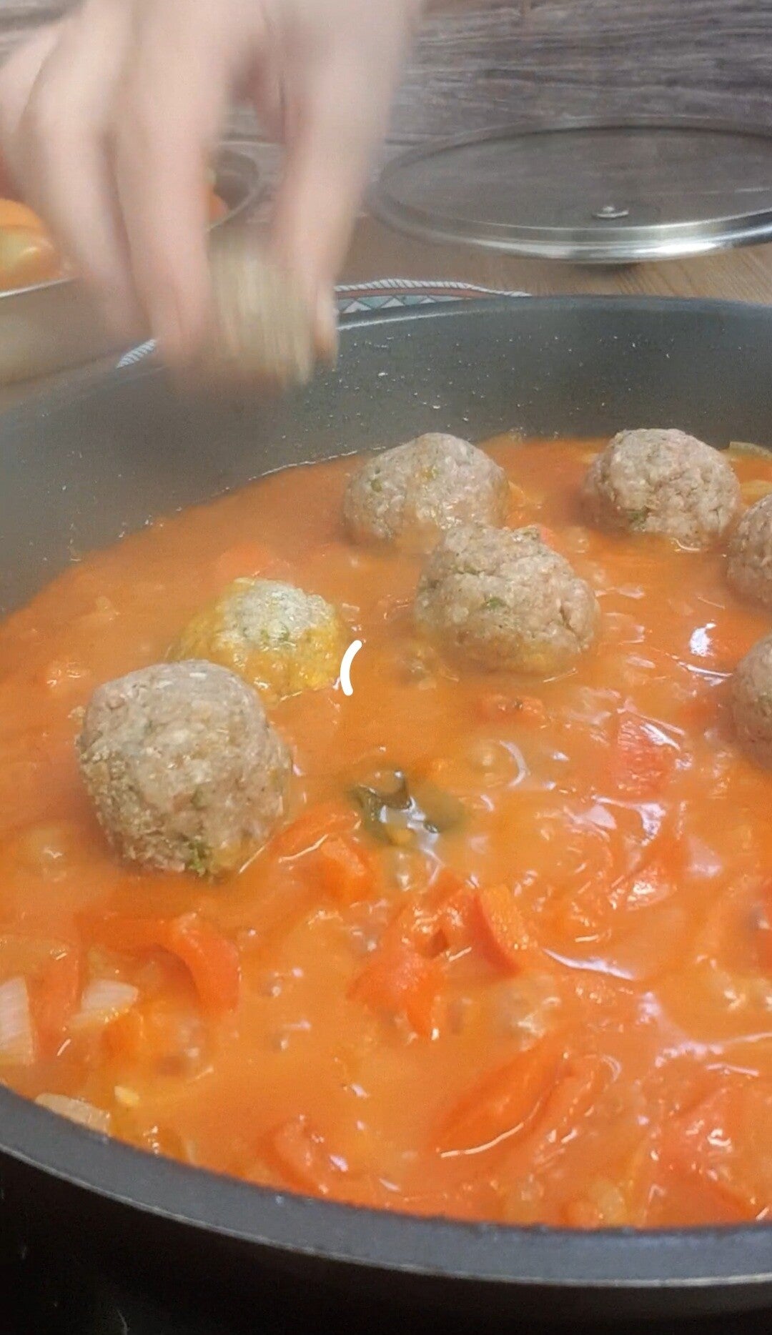 Appena terminate le vostre polpettine, ne verranno circa 15 pezzi, fate appassire della cipolla con i peperoni a listarelle in padella. Sfumateli con un po' di vino bianco e, una volta evaporato, aggiungete il barattolo di pelati precedentemente mixato, allungate con mezzo bicchiere d'acqua e tuffate le polpettine nel sugo una a una