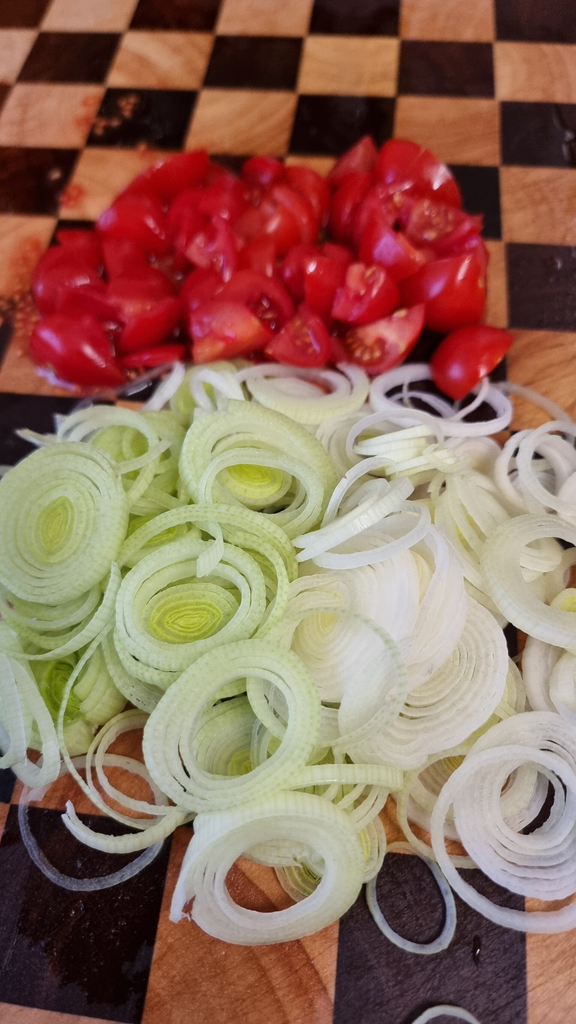 Taglia i porri a rondelle e i pomodorini a tocchetti.